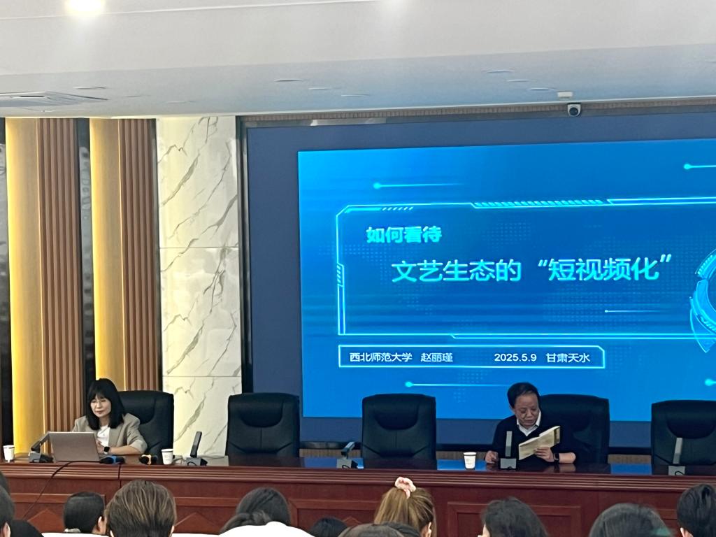 2025年5月9日,西北师范大学传媒学院赵丽瑾教授应邀来到我校,开展了一场以“如何看待文艺生态的‘短视频化’”为主题的讲座,深入探讨了当下文艺生态与短视频融合发展的现状、影响及未来走向。本次讲座由王元忠教授主持,23级戏剧影视文学专业全体学生参与。