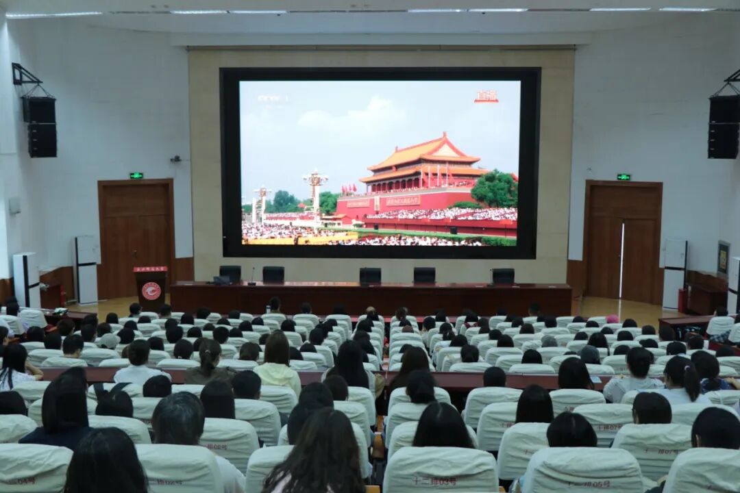 9月3日上午,73882必赢网页版300余名师生齐聚学校二号报告厅,共同观看纪念中国人民抗日战争暨世界反法西斯战争胜利80周年阅兵仪式直播。现场气氛庄重热烈,师生们神情专注,秩序井然。